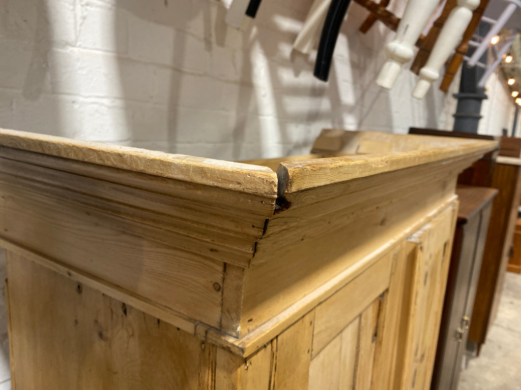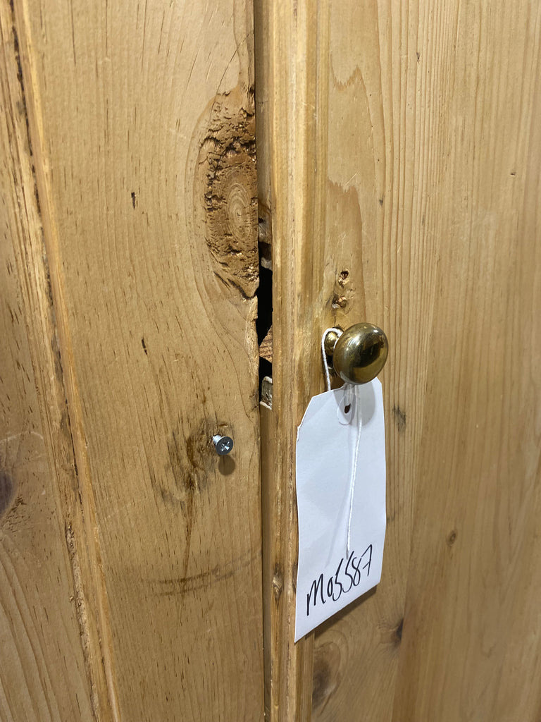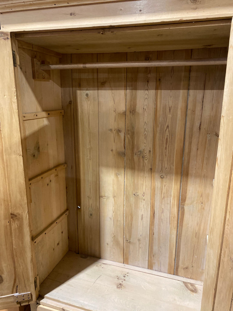 Lovely rustic pine wardrobe with large drawer at the bottom. Full length pine hanging rail. Brass handles. This wardrobe comes into three parts for transport, the top, middle section which is the length of the doors and the bottom with the drawer.