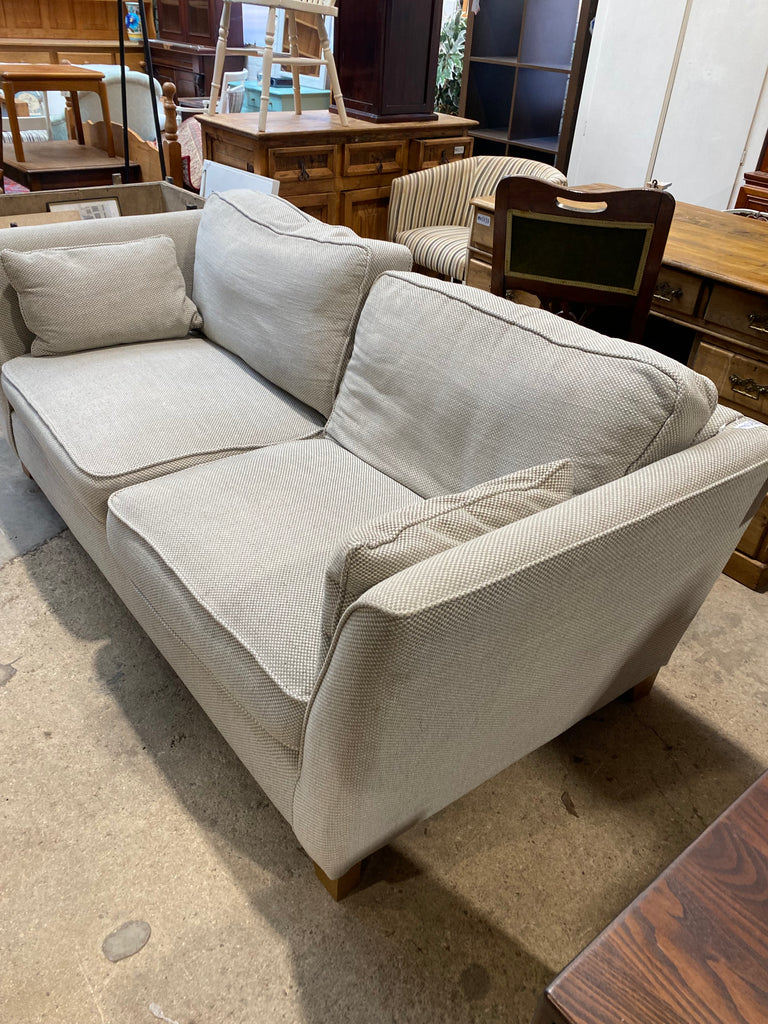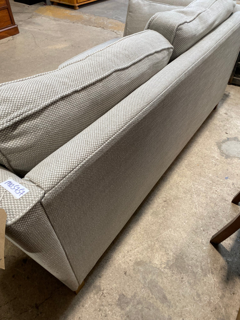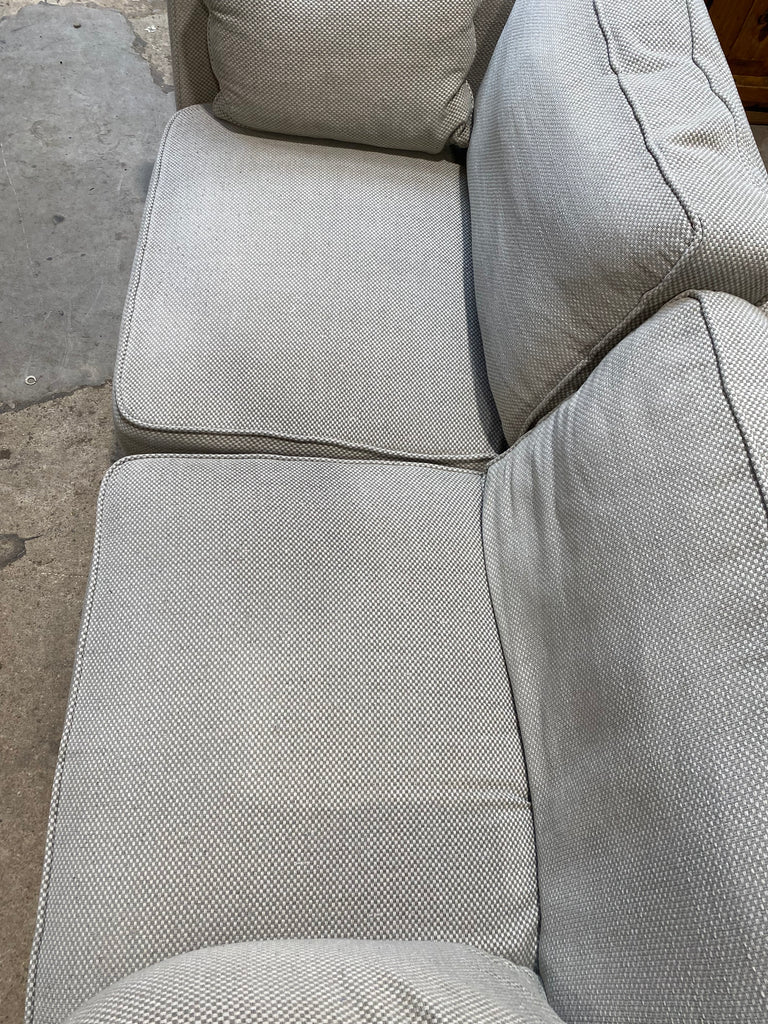 Contemporary Grey Fabric Sofa With removable seat and back cushions. White and grey woven fabric design.