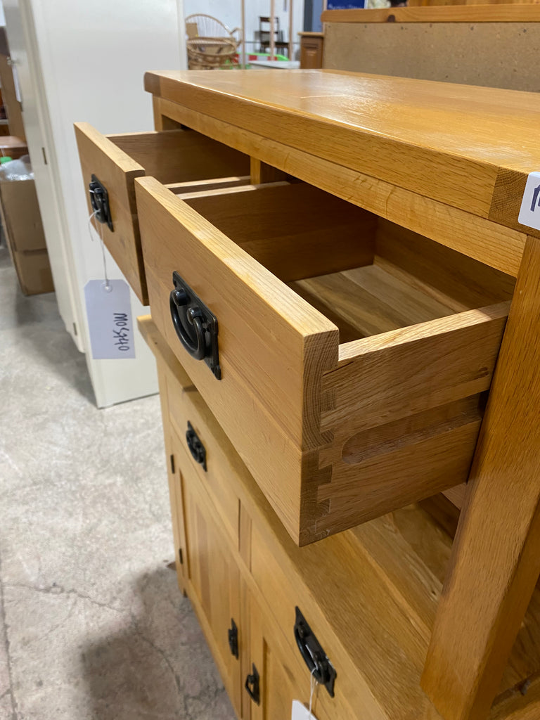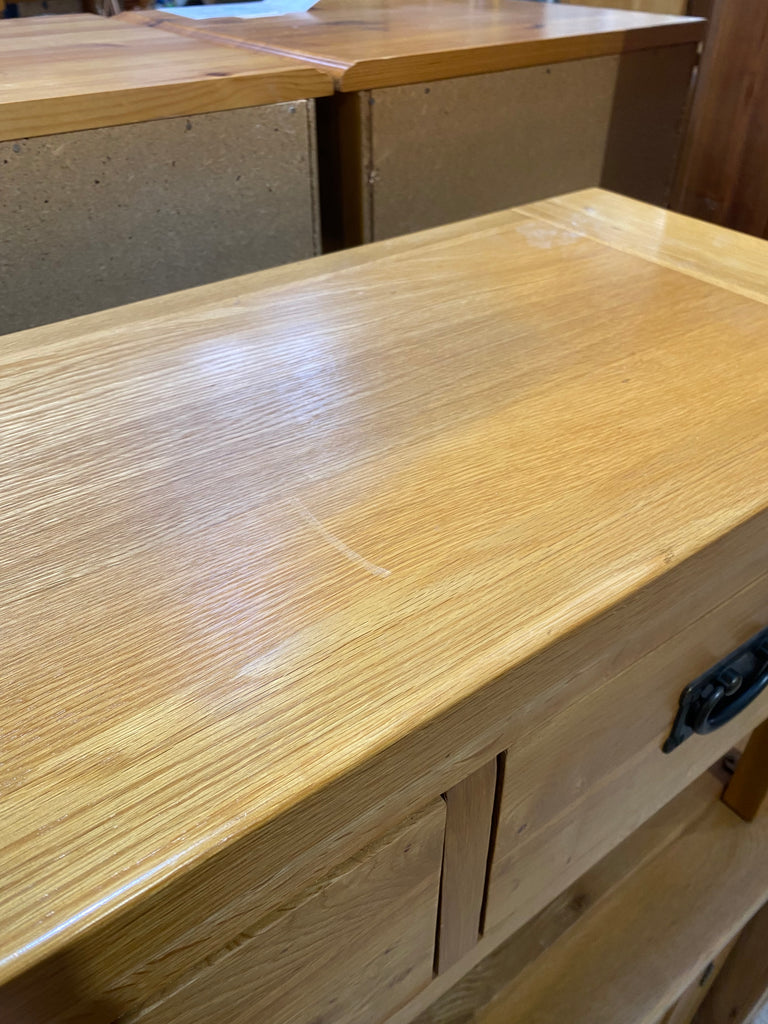 Lovely contemporary solid oak TV Stand with two smooth running Drawers. The back has been modified for a corner - see photos