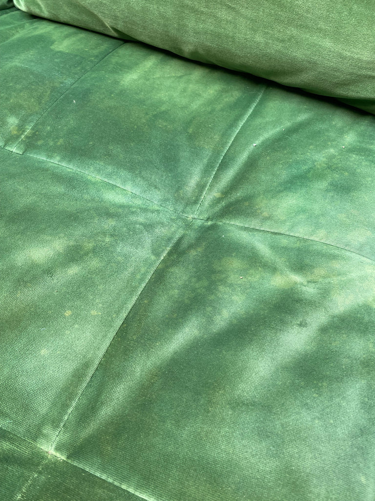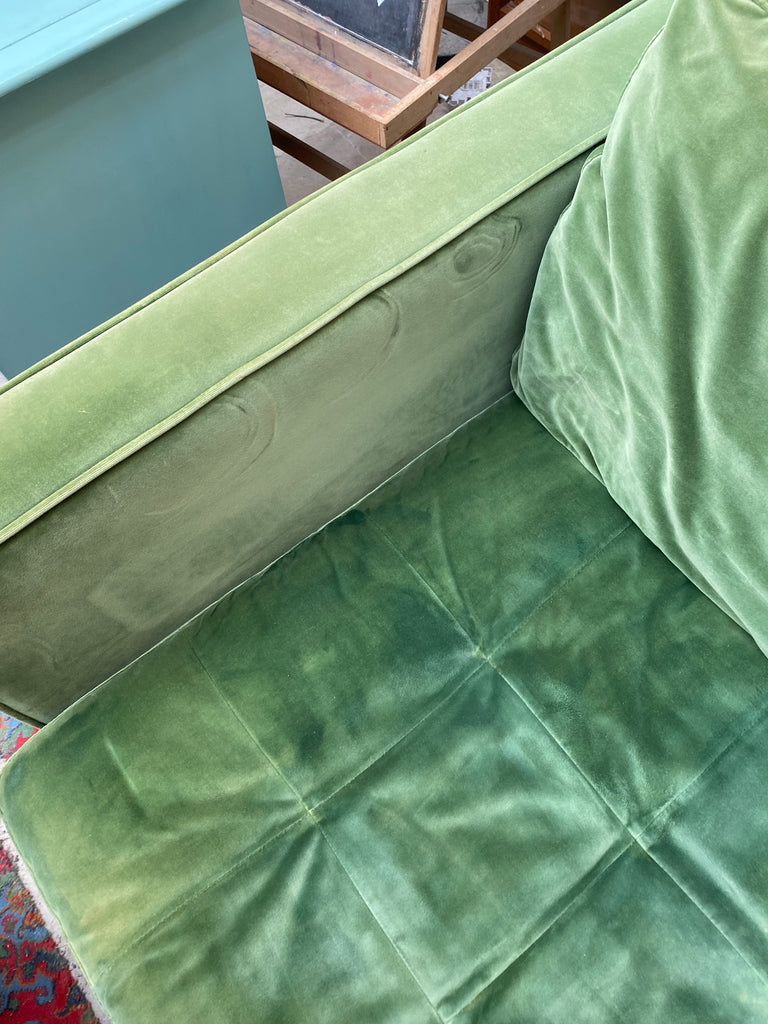 Green Velvet Sofa & Ottoman From made.com With removable seat and back cushions. Legs are a dark wooden tapered design which unscrew easily. Fabric on main seat has been retouched with due to a bleach stain, has come out very well with a mottled effect - see photos.