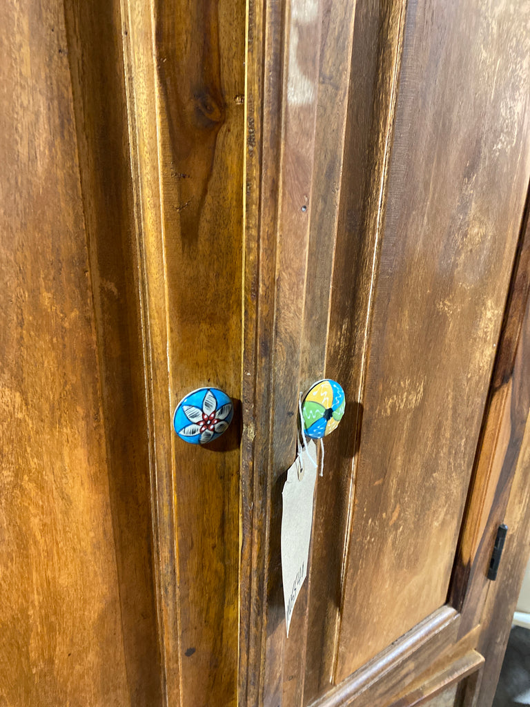 Overall in great condition, with expected marks, dents and scratches to the wood. The wood has swollen with moisture so the cupboard does not currently close snd drawers are stiff