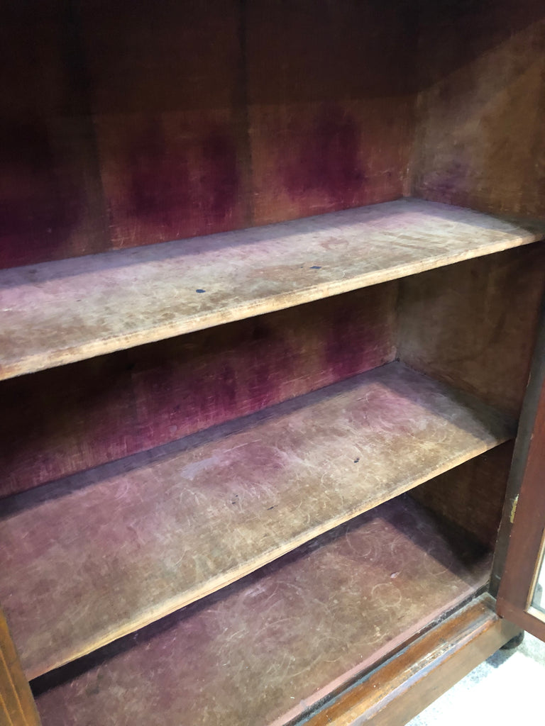 Unusual Antique Pier Cabinet with Inlaid & Brass Detailing, made from mahogany and walnut. Two fixed shelves inside covered with a beige pink velvet. Ball feet raising the cabinet just off the ground. Working key.