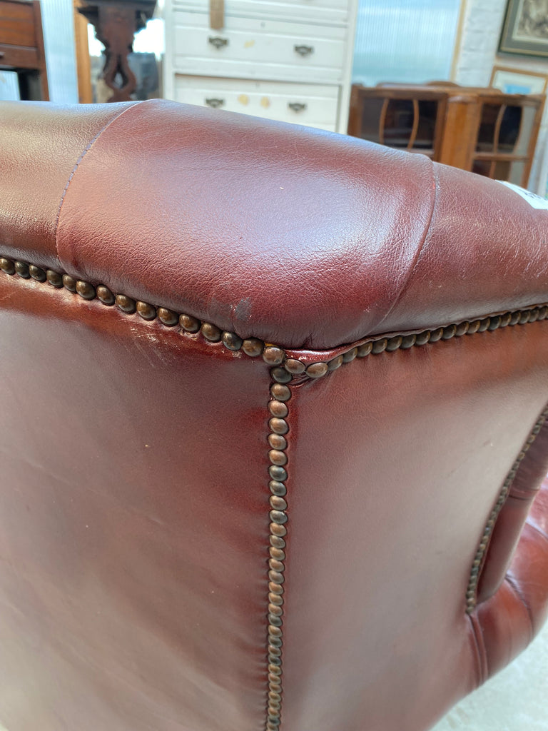 Chesterfield Style Oxblood Leather Wingback Armchair with studded detailing. Removable seat cushion. The chair is on wheels, all smooth running.