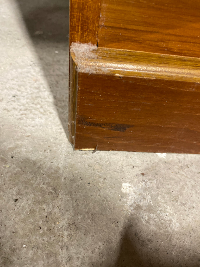 In good condition overall - some scuffs marks and scratches as expected with age and use. Some chips snd peeling of veneer in places. A hole has been cut in the back for wires.