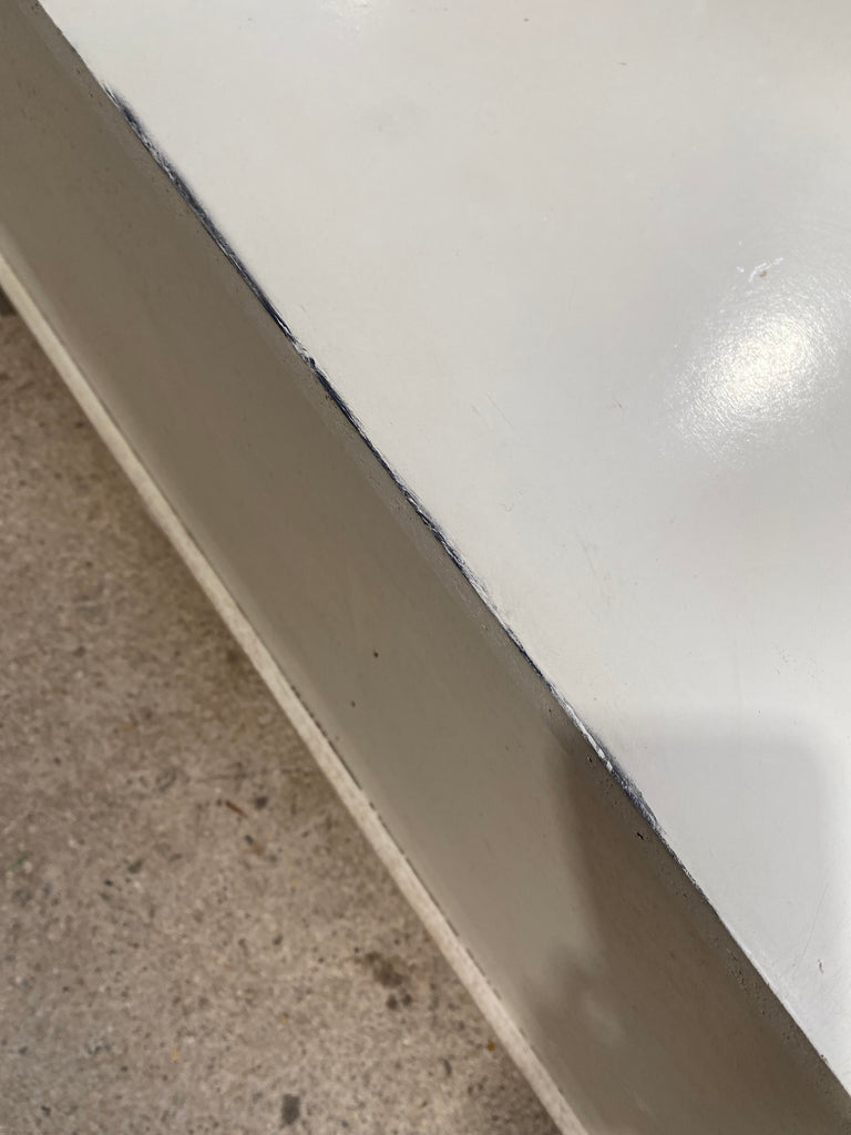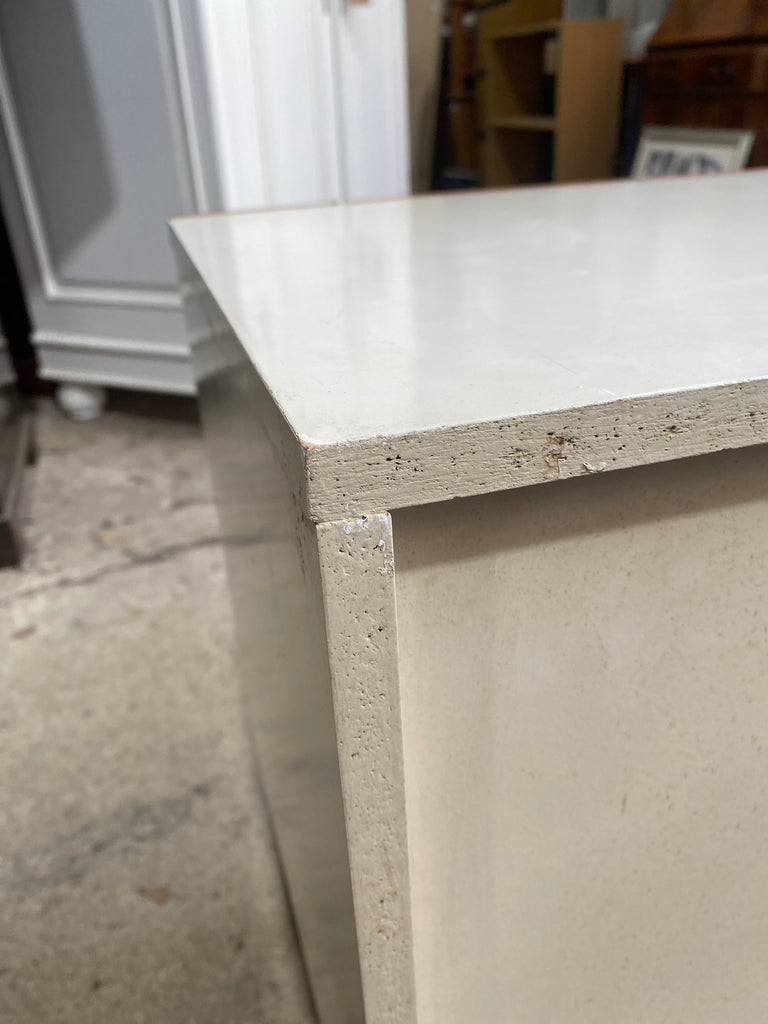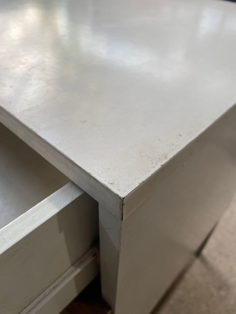 In good condition overall - some scuffs marks and scratches as expected with age and use. Some peeling and chips in veneer in places, some rust marks on metal. One back leg is bent but drawers still sit securely.