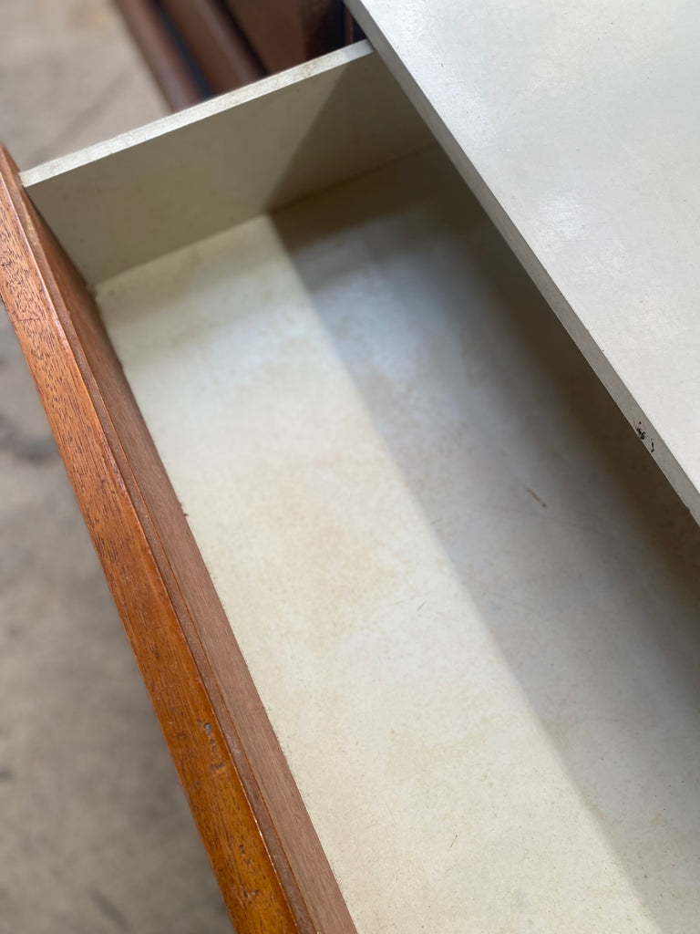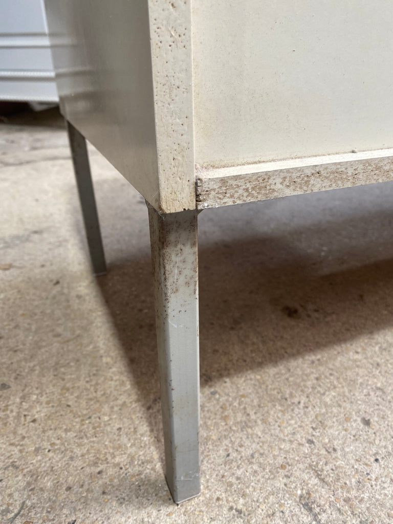 Interlubke Low Mid Century Chest of Drawers. This Scandinavian design with metal legs, teak fronted drawers and off white frame.