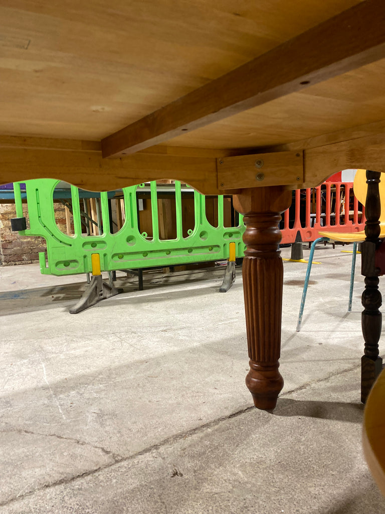 Large Wooden Dining Table With attractive turned legs. Rich warm coloured stain on the wood. Legs can be easily taken off for easy transport.