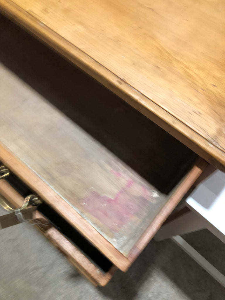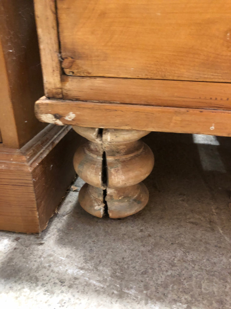 In good condition overall - some scuffs marks scratches and dents as expected with age and use. The bottom of one drawer has been partly replaced. Some larger cracks on the feet.