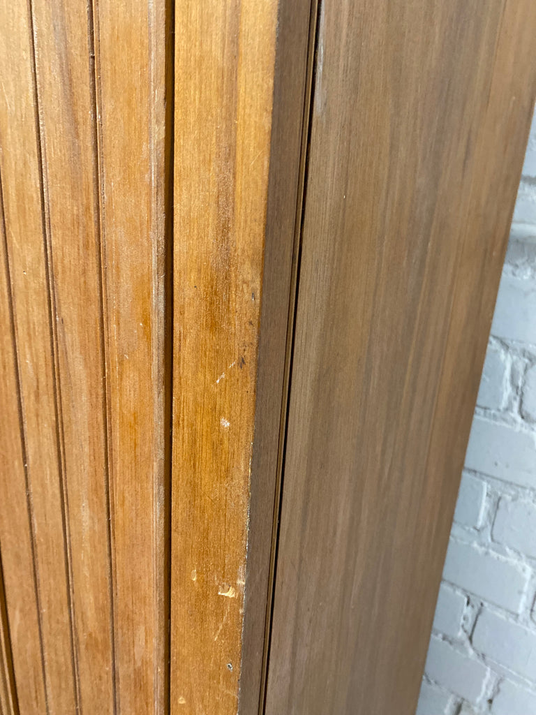 Rustic Pine Single Wardrobe. Its item is a project as the wood has swollen, and wood pieces have broken away. Only fits a small hanger as is quite shallow. Full length mirror. Brass hardware. No key.