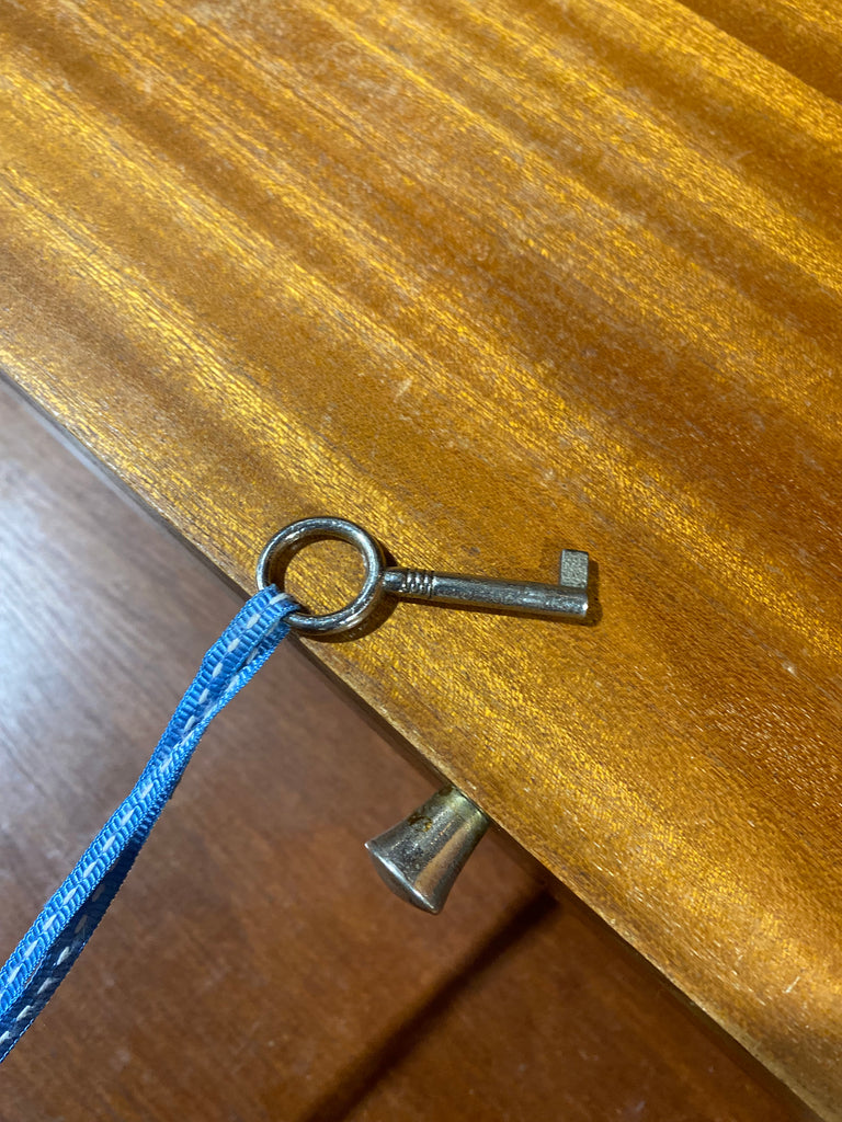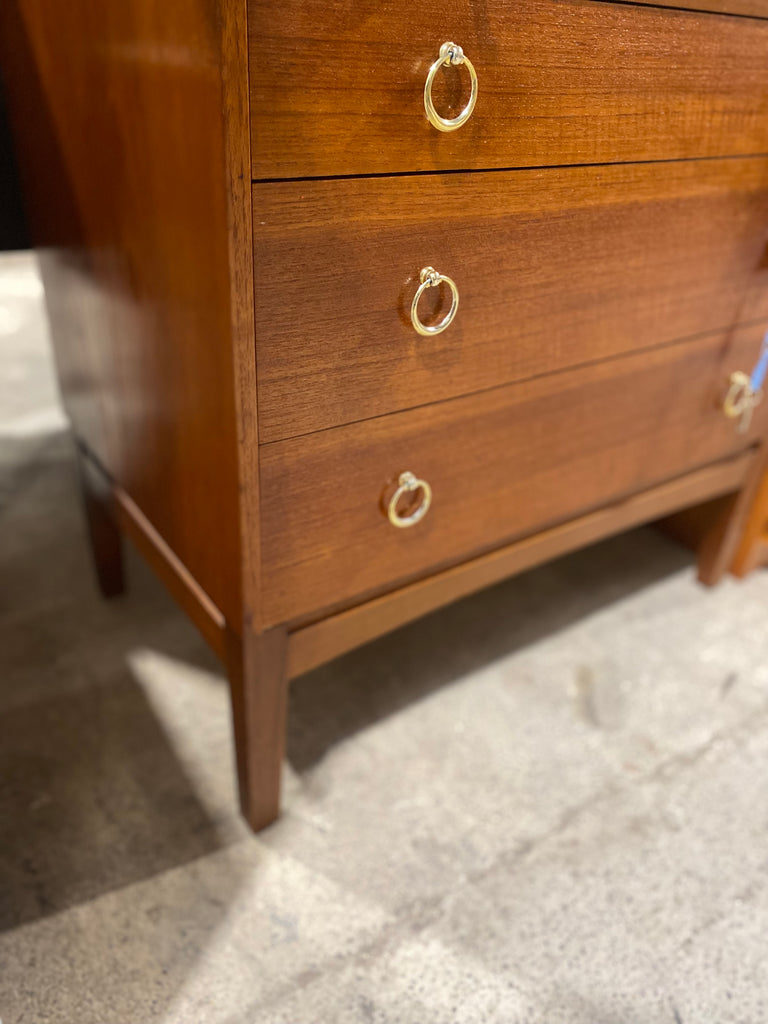 Vintage Teak Bureau With three drawers and polished brass hardware. Working key for lock, is a bit stif.