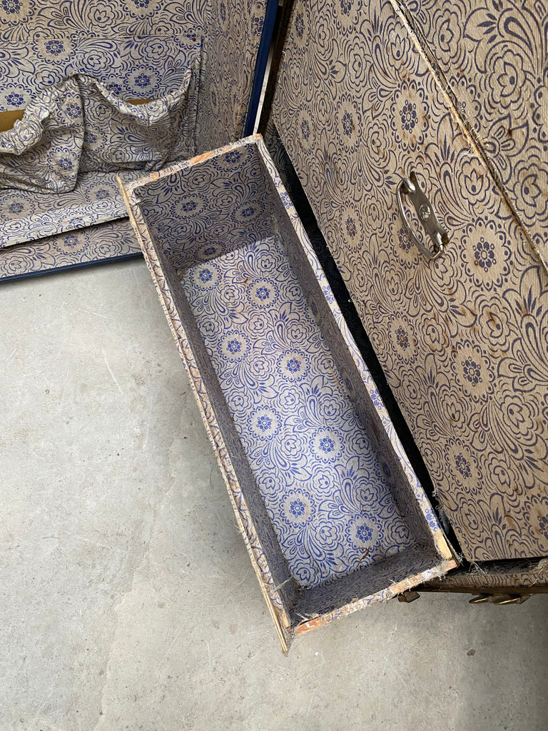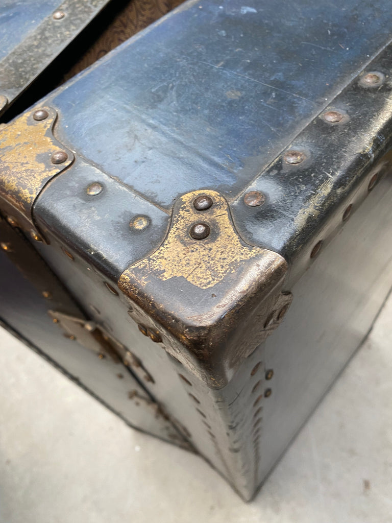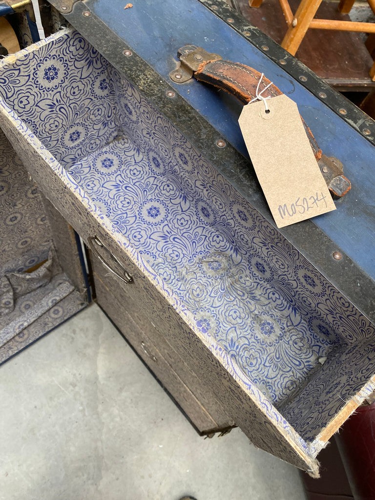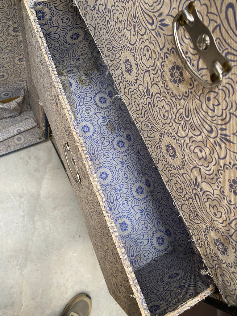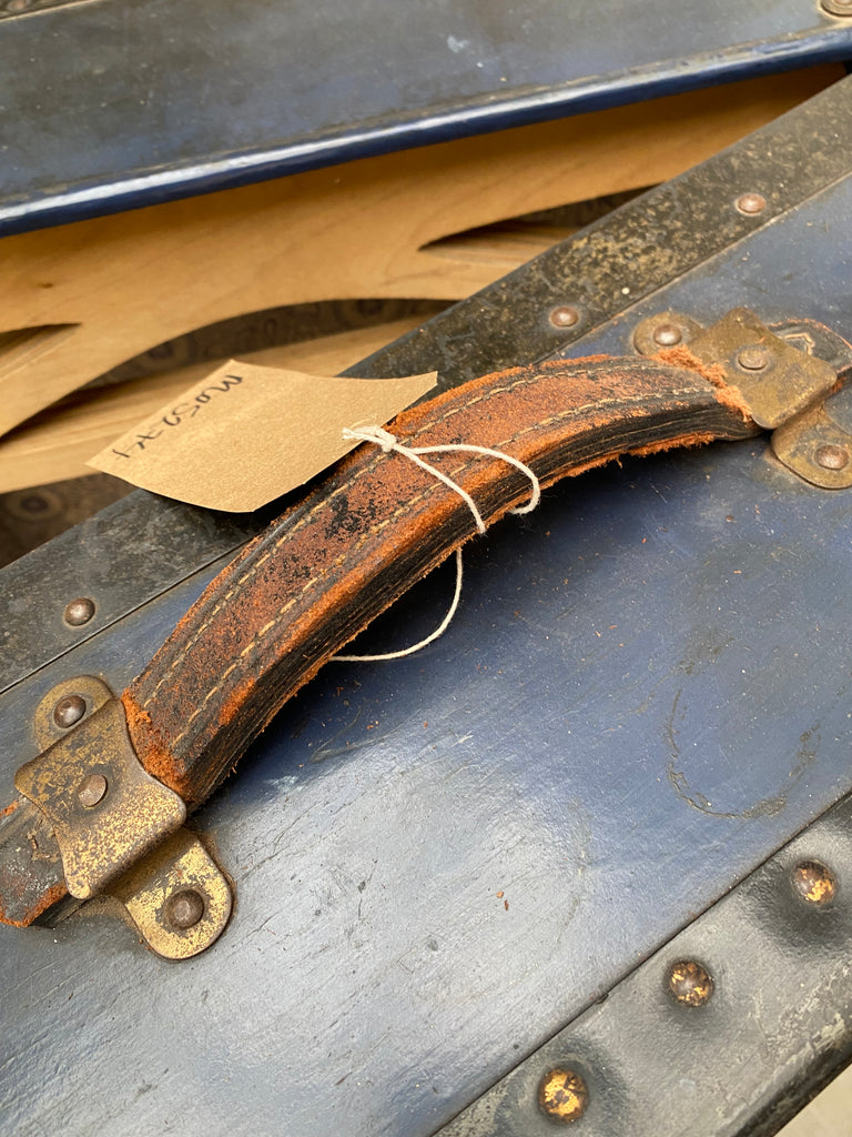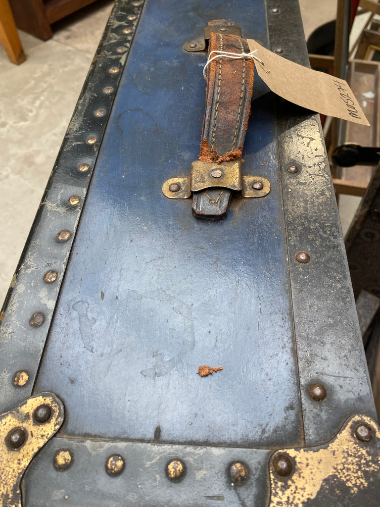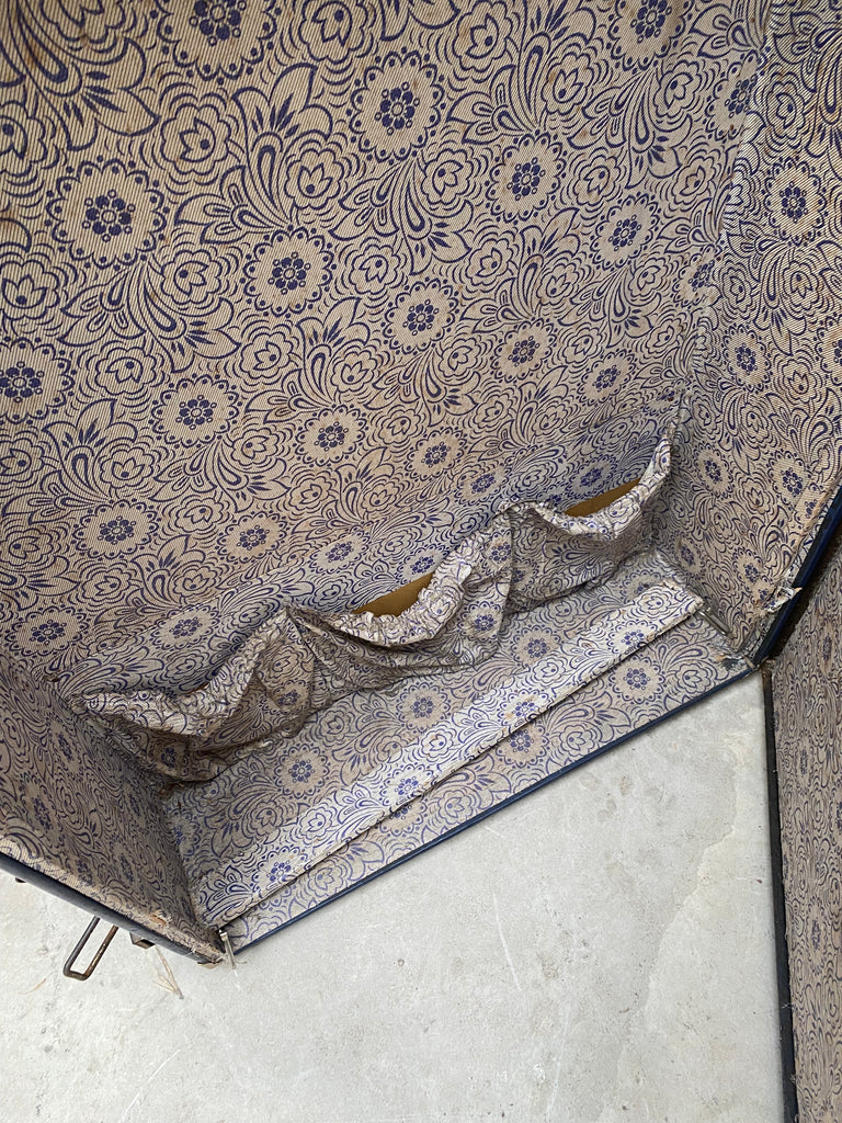 In fairly good condition overall - some scuffs marks and scratches as expected with age and use. Some dents on the trunk and rips and wear to the fabric and handle.