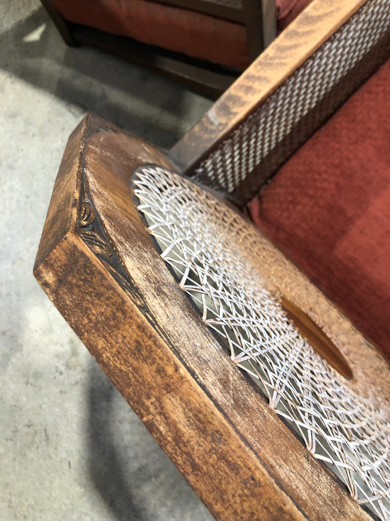 Lovely Art Deco Cane & Walnut Framed Armchair with circular cane design on the back finished with veneer interior and surround. Red fabric seat.