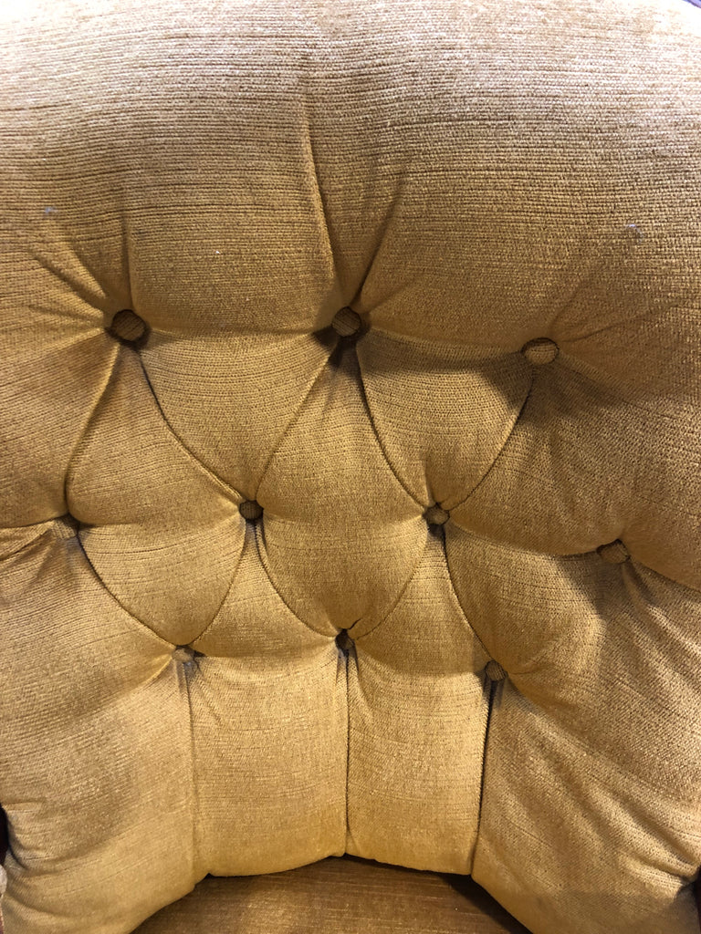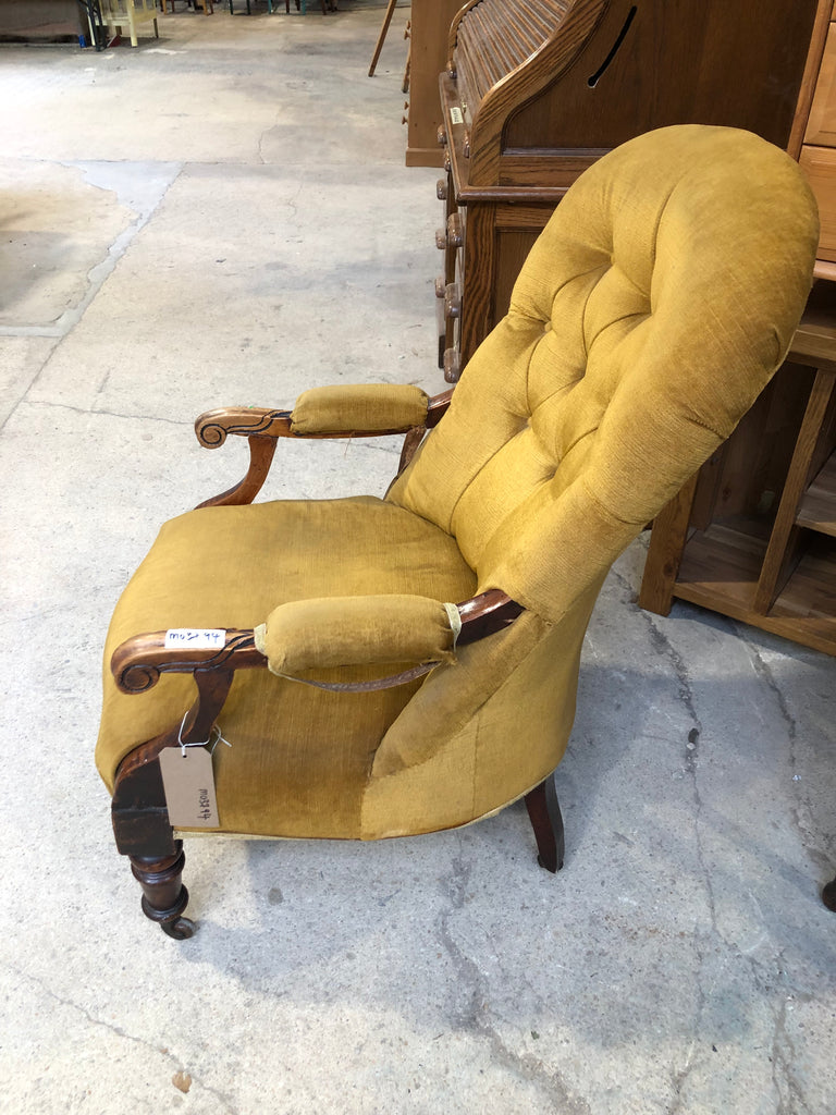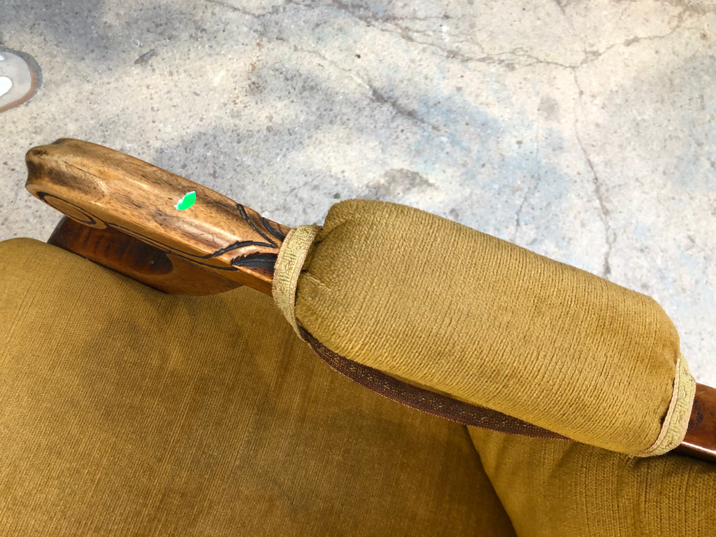 In fairly good condition, scuffs marks and chips to the wood, marks and wear to the fabric. Some pulling at rips and repairing needed at points.