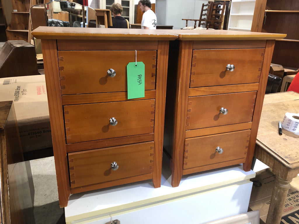 Pair of bedside drawers with three drawers with dovetail joints and silver knobs.