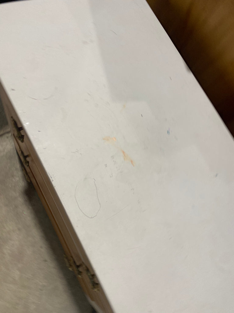 Solid and sturdy, few marks and scratches. All drawers open and close smoothly