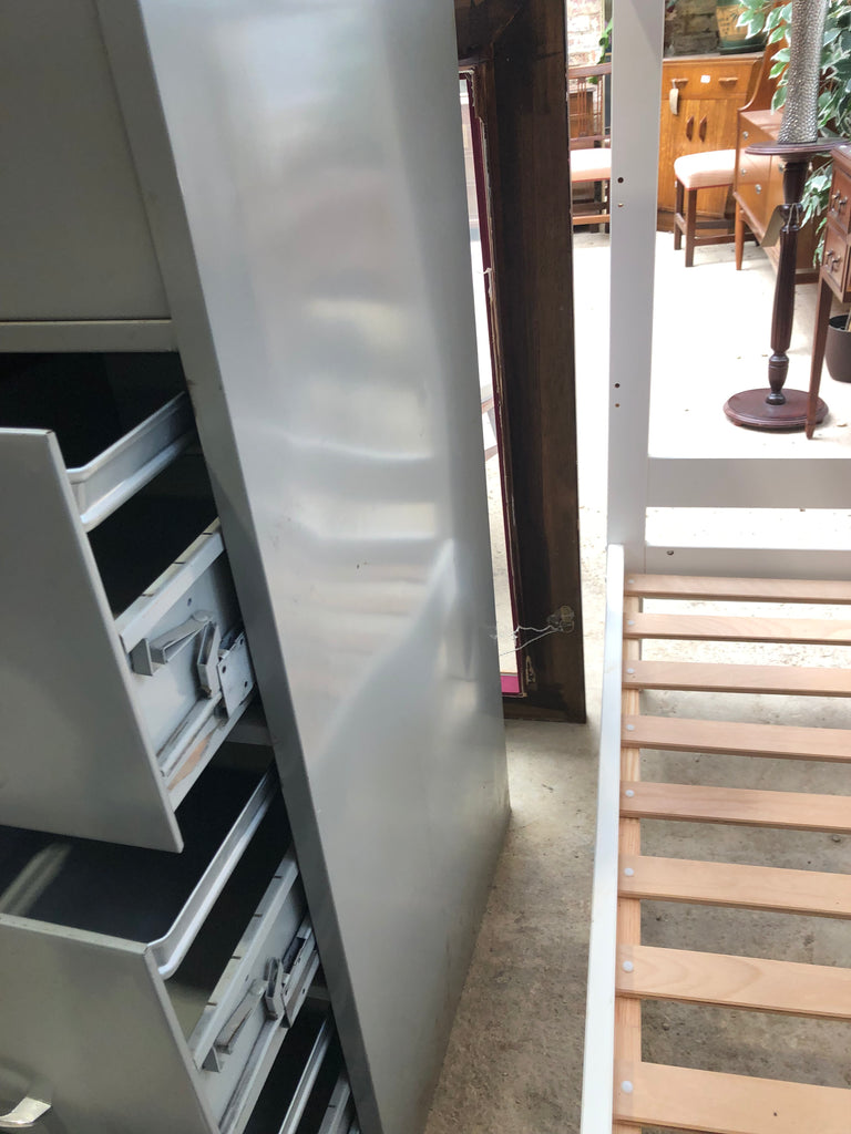 Tall grey metal filing cabinet with working key for the top drawer. Four smooth running drawers